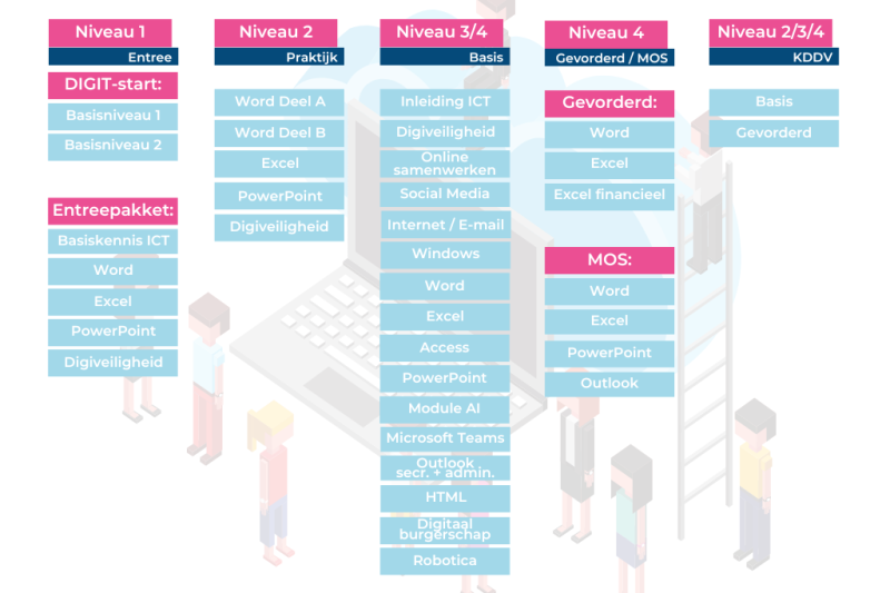 DIGIT-mbo is dé portal voor het aanleren van digitale vaardigheden. Er zijn modules voor uiteenlopende onderwerpen als onder andere: AI, Windows, Word, PowerPoint, Office, Google Docs, AI, Internet en E-mail, HTLM, Digiveiligheid, Social Media en Online Samenwerken.